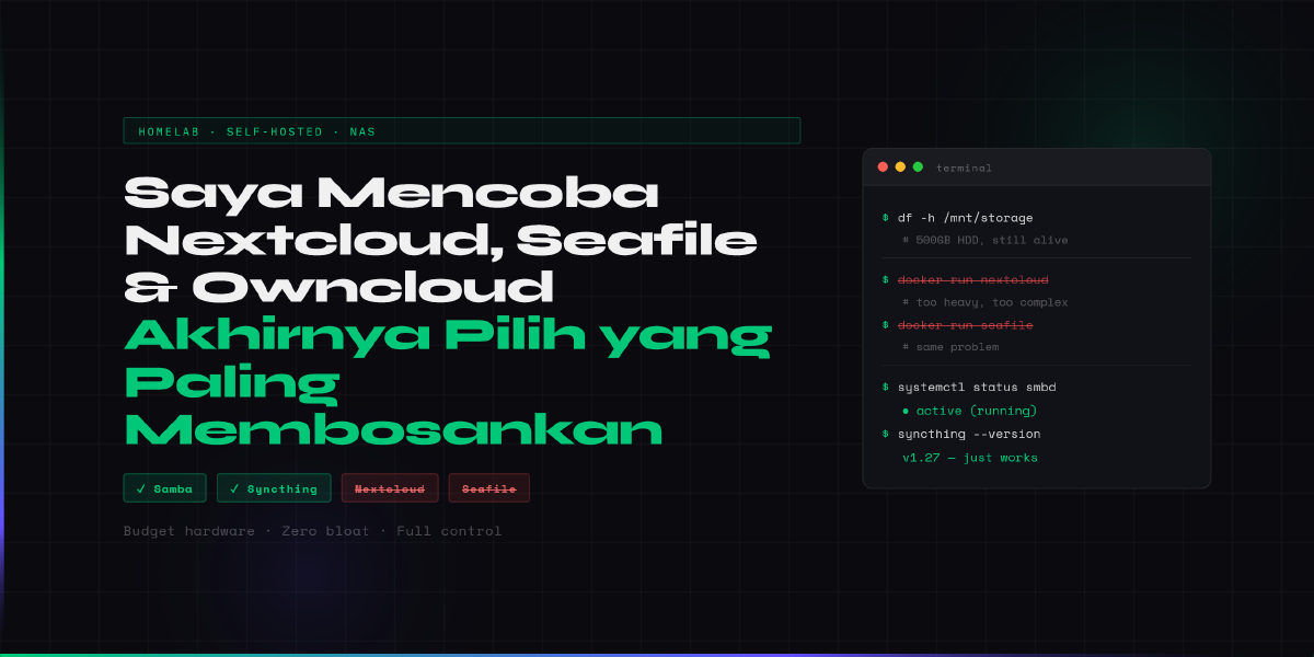 Kalau kamu cuma mau akses file dari mana saja di rumah dan sync foto dari HP, Samba + Syncthing sudah lebih dari cukup. Kalau kamu mau belajar Docker dan self-hosting, laptop bekas dengan Debian sudah bisa jalan. Kalau kamu mau eksplor virtualisasi, Proxmox bisa install di hardware yang banyak orang buang.