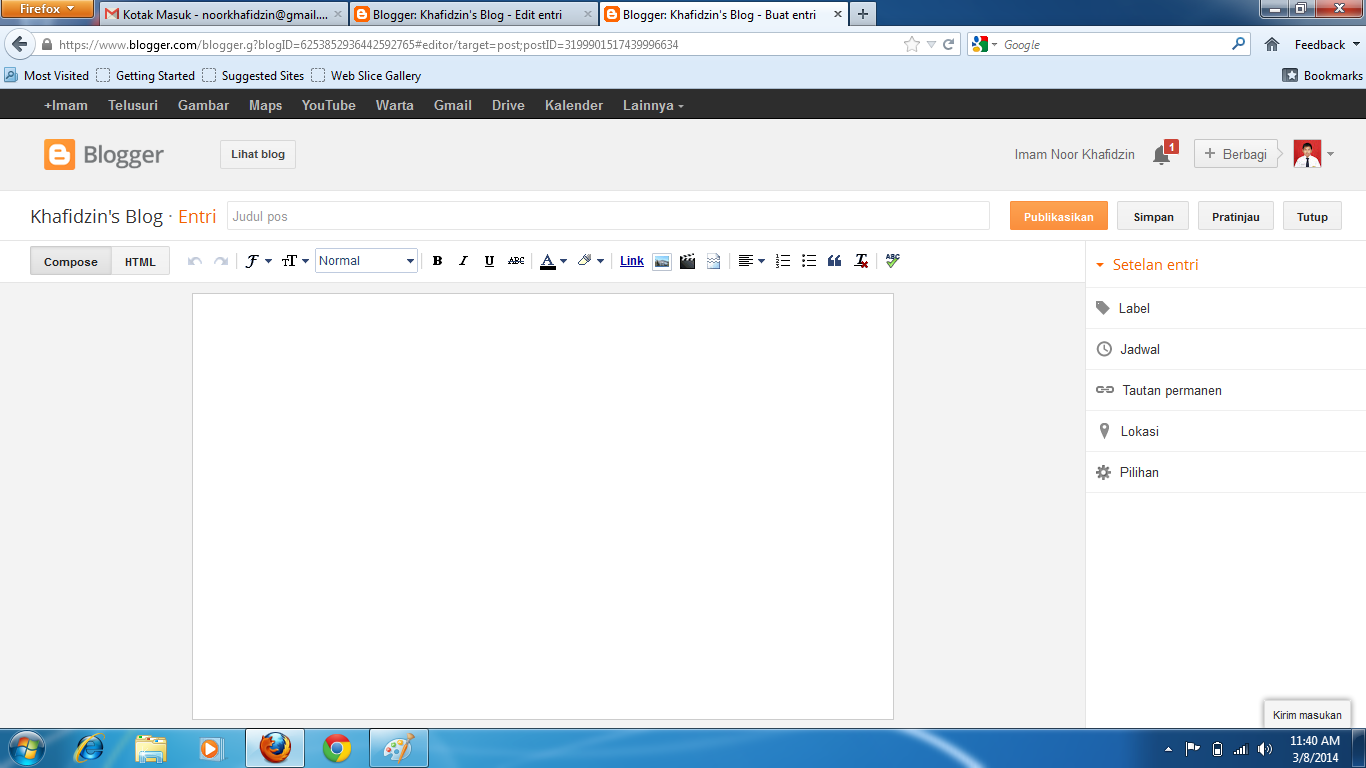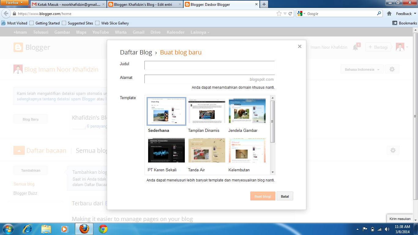 setelah login, klik buat Blog, kemudian Anda disuruh untuk mengisi Judul Blog pada kolom Judul, Lalu Alamat Blog, misal noorkhafidzin**.blogspot.com,** dan pilihlah desain Template yang Anda inginkan, yaitu desain untuk mempercantik blog.