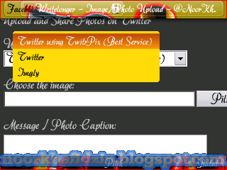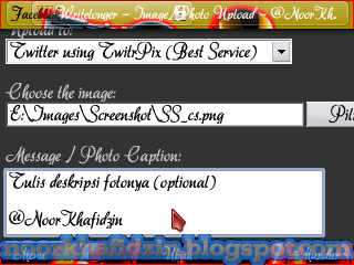- Kemudian pilih metod upload via Twitter using Twitrpix (Best Service), Twitter, atau Imgly. sebagai contoh Saya pilih yang diatas, lalu pilih file foto yang ma di unggah dan deskripsinya.