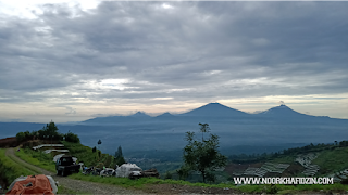 Kondisi langit sudah muncul beberapa awan, arah timur sudah tertutup awan. Dari sini terlihat jelas gunung sindoro dan gunung Slamet. Setelah puas berfoto-foto, kami turun.