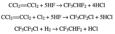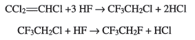 Pertama, CF3CH2F (HFC-134a) biasanya dibuat dengan mereaksikan trikloroetilen dengan hidrogen fluorida dan katalis cair seperti BF3, TaF5, dan MoCl5. Reaksinya sebagai berikut: