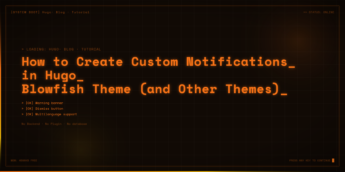 Custom notifications in Hugo don’t require plugins, don’t require heavy JavaScript frameworks, and don’t require modifying theme files directly.